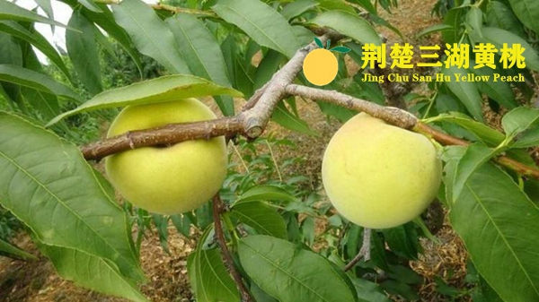 标志明显包括“绿叶、鲜黄卡通黄桃”+“荆楚三湖黄桃Jing Chu San Hu Yellow Peach”的标志